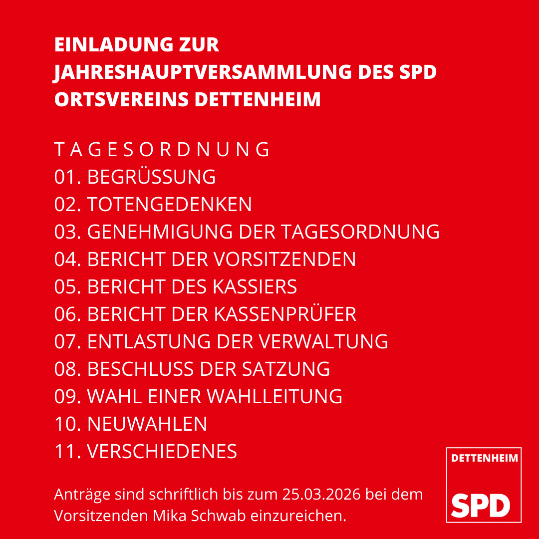 Einladung zur Jahreshauptversammlung des SPD Ortsvereins Dettenheim am Mittwoch, 01. April 2026, um 19:00 Uhr in der Gaststätte Vogelpark.
